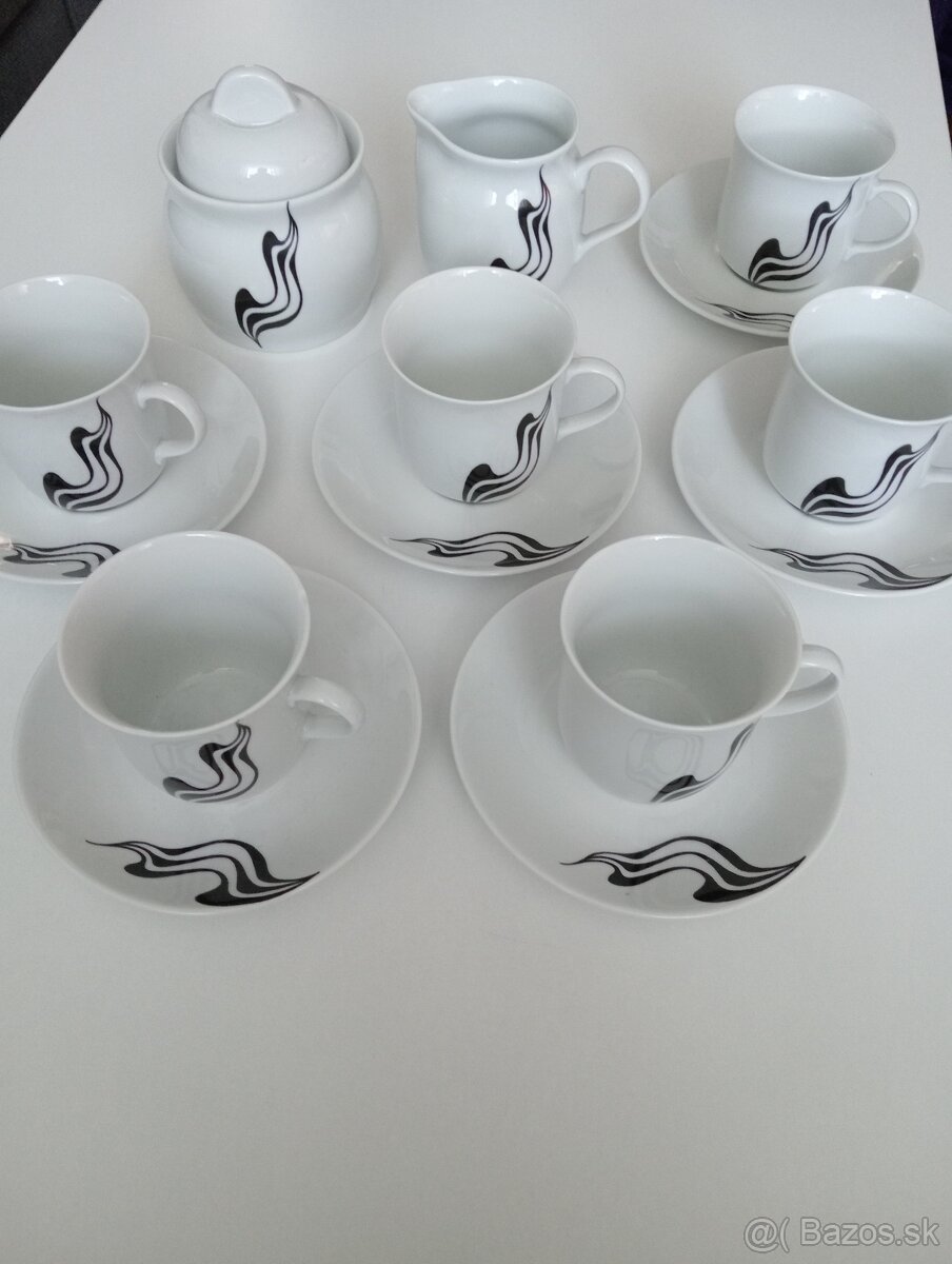 Predám krásnu kávovú súpravu - 6 šálok, 6 podšálok, cukornička, kanvička na mlieko - 14 ks spolu, biela s čiernym vzorom. Cena 20 EUR. Len osobný odber.