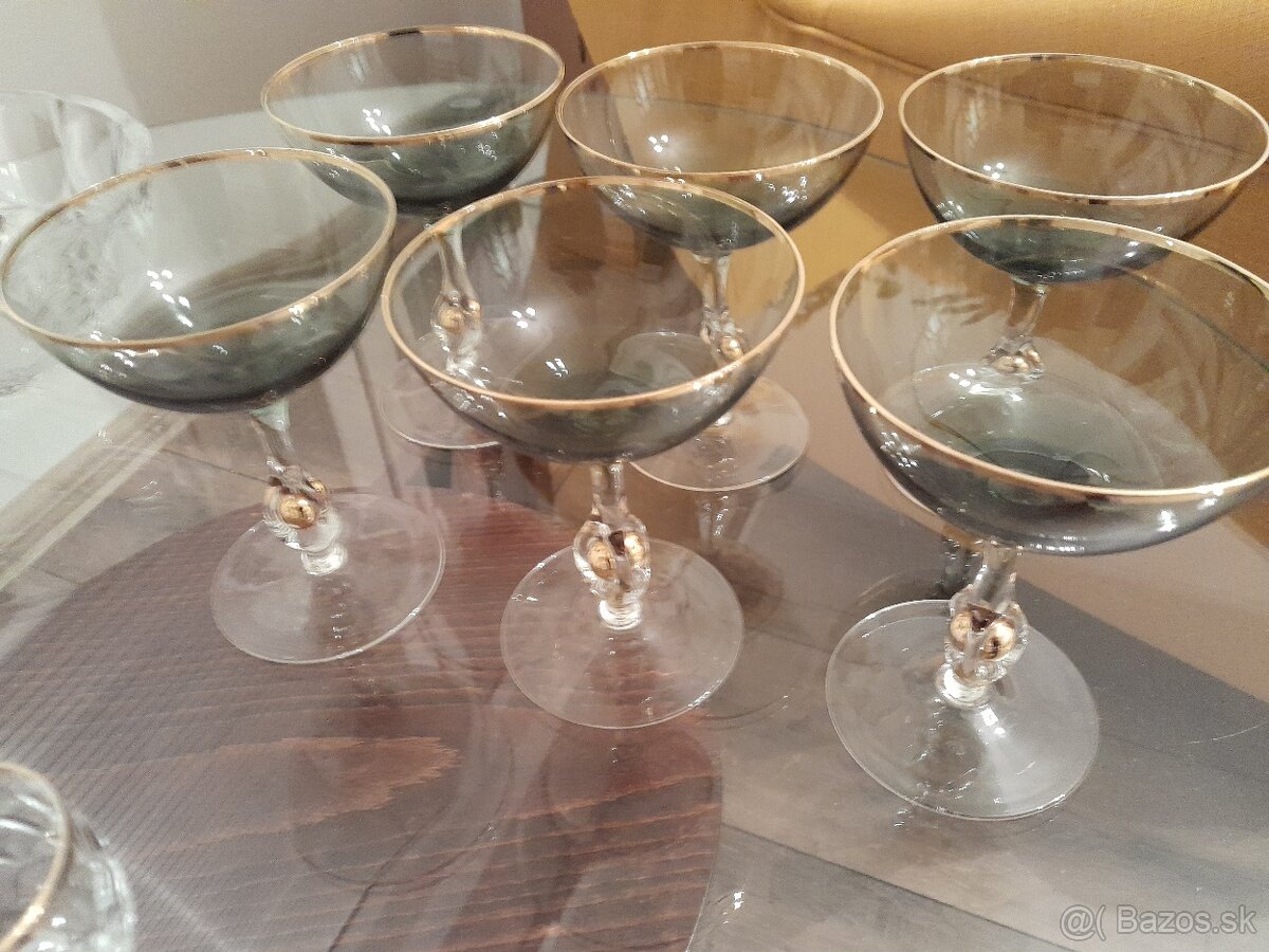 Predám sadu 6 štýlových pohárov na šumivé víno alebo koktaily. Tmavý kalíšok so zlatým lemovaním, číra stopka s ozdobným zlatým detailom. Vhodné na slávnostné stolovanie, dekoráciu alebo ako darček.