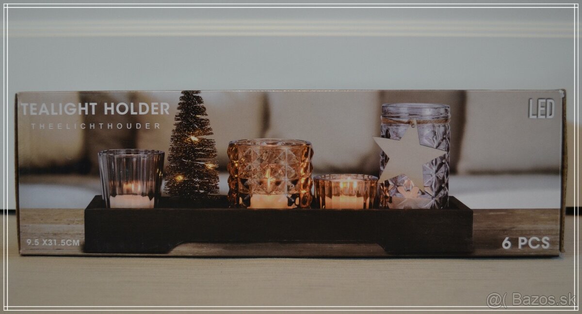 HOME DECORATION - svietniky (sada) - obsahuje štyri sklenené svietniky, stromček s LED osvetlením a drevený podstavec.