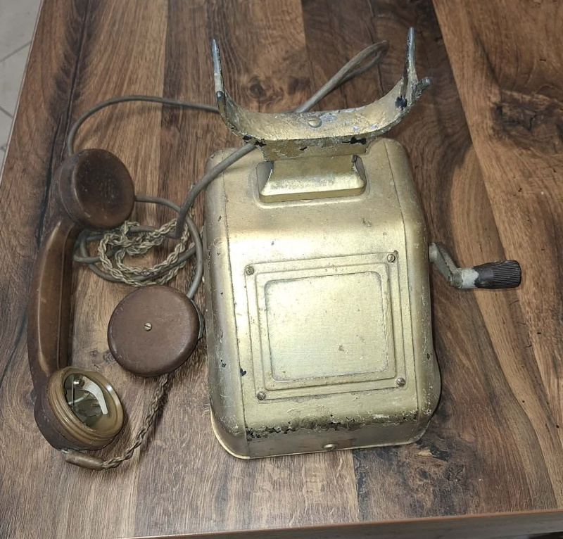 starý telefón, kovový, s kľukou, v nálezovom stave, ako na foto, chýba kryt na mikrofóne