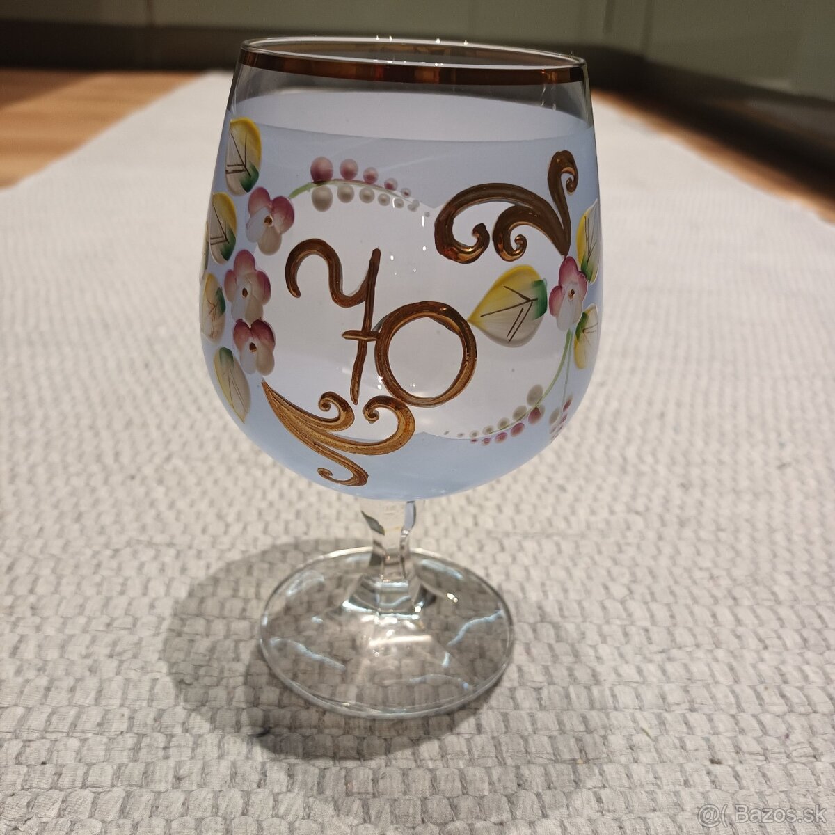 Starší jubilejný pohár na koňak z novoborského skla, na stopke, v jemnej modrej farbe so zlatým okrajom a ručným zdobením, vhodné ako darček, obdobie po r. 1990.