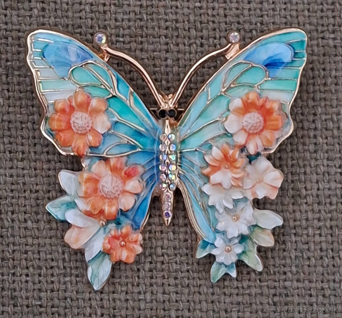 Nádherná brošňa v tvare motýĺa s jvetmi, zdobená smaltom -bledomodrej farby