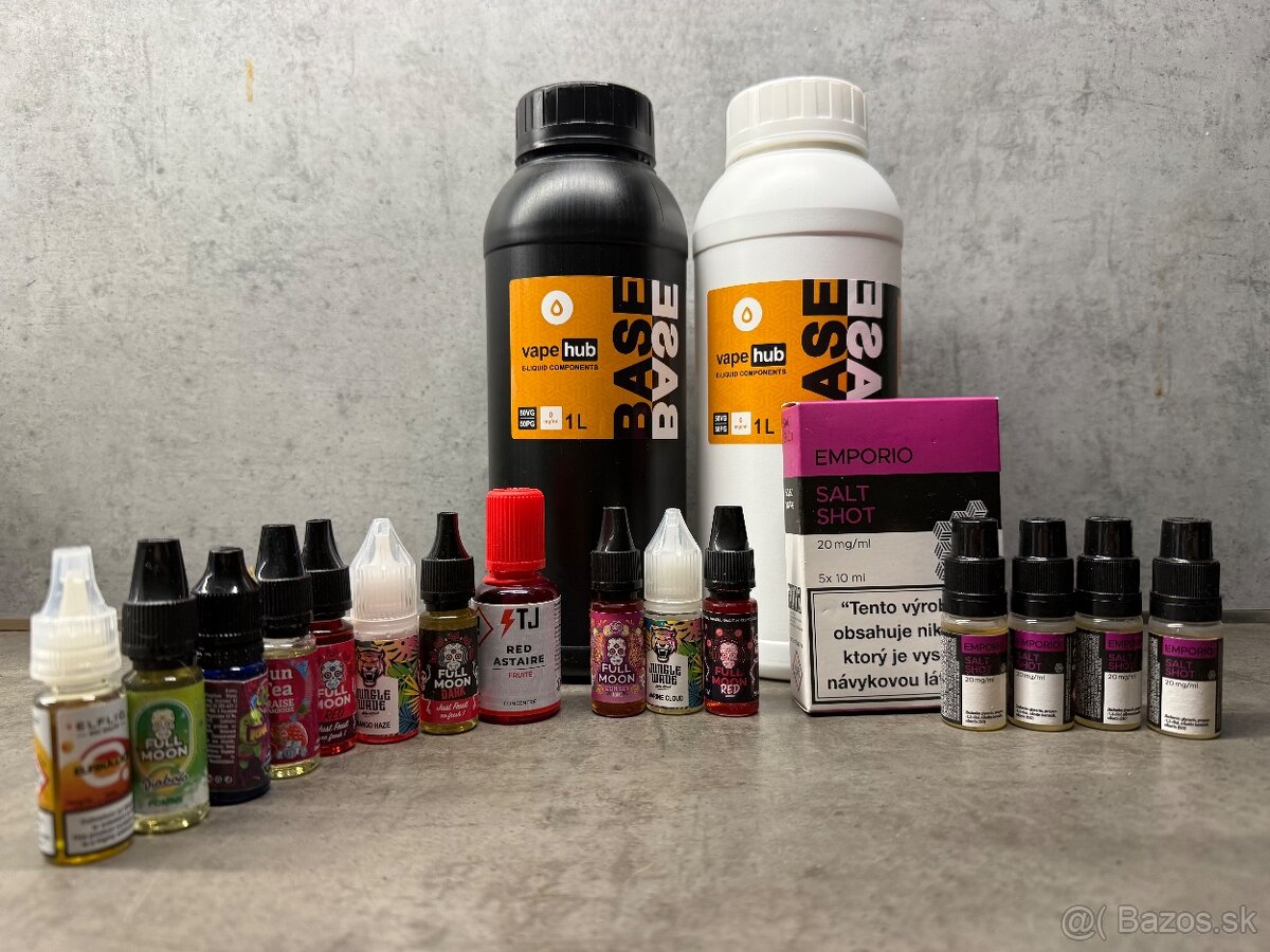 Predám najlepšie spolu všetko. 2x 1l báza neotvorená, 9x nic salt, 2x namiešané, 1x odskúšaný Elfliq, zvyšok príchute, z jednej trocha odobraté, ostatné len otvorené, lebo som chcela vedieť, ako voňali. Všetky sú ovocné. Bohužiaľ sa tie už namiešané vôbec nepodobali chuti značky, na ktorú som zvyknutá, preto mi to teraz stojí doma a kupujem si hotové z mojej obľúbenej značky. Toto všetko ma vyšlo okolo 100€ ešte pred zmenou zákona. Osoby pod 18 prosím nepísať.