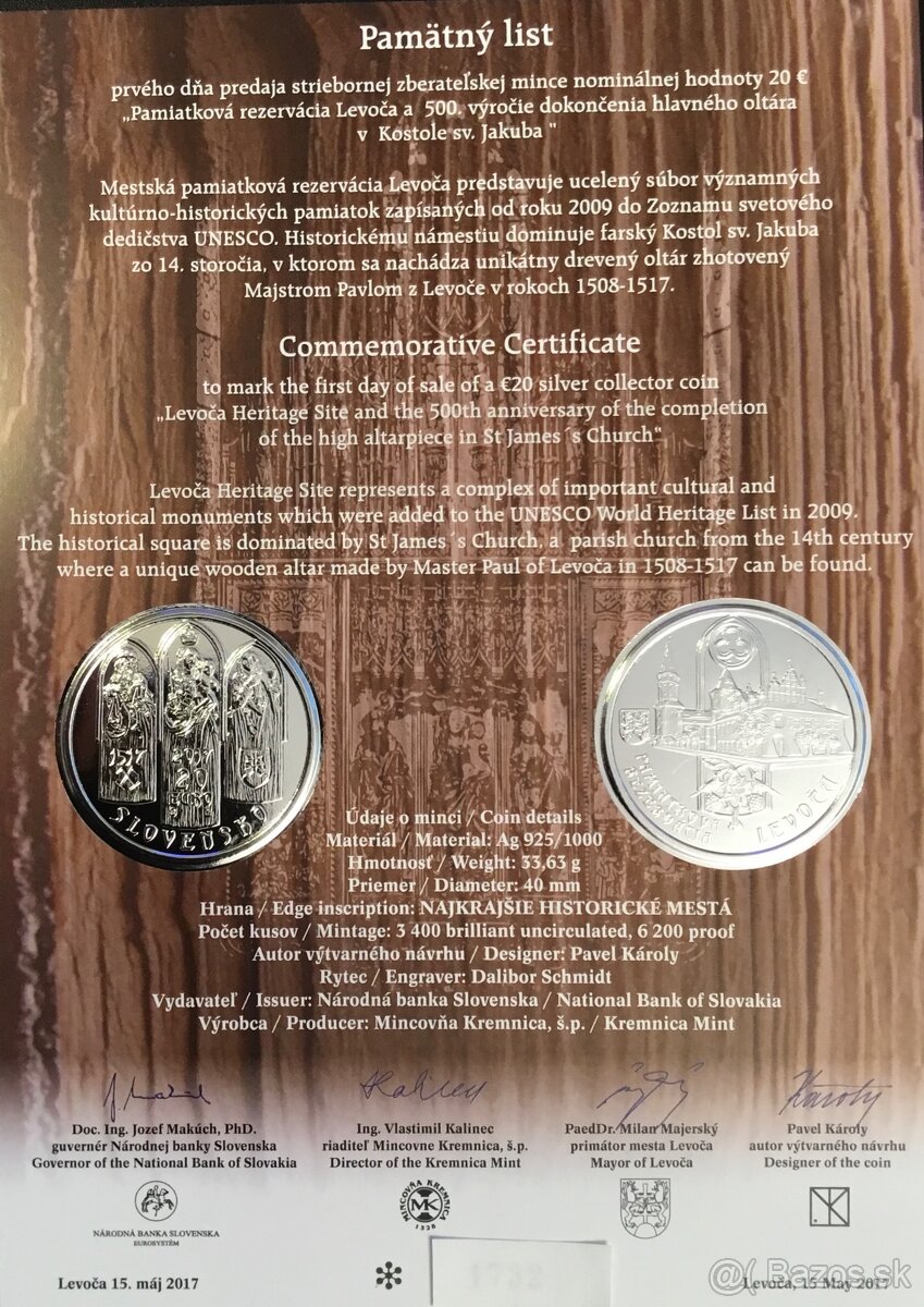 2017/20€ pamiatková rezervácia Levoča a 500. výročie dokončenia hlavného oltára v Kostole sv. Jakuba - Pamätný list