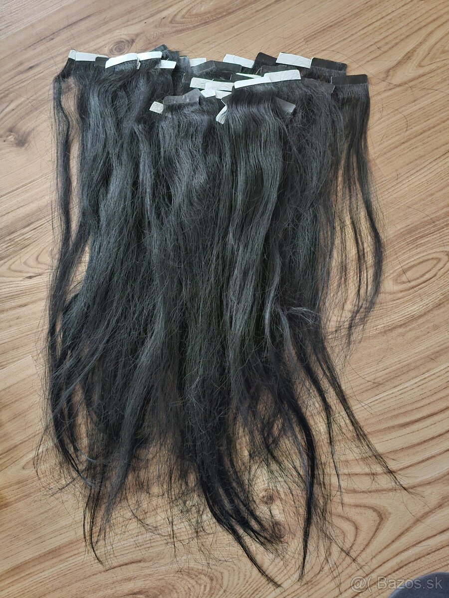 Predám 1x použité čierne ľudské vlasy v dĺžke 50cm, je ich cca 50 trsov,uz pripravené na použitie,zmyté,vyčistené, ponúkam k nim aj ďalšie pásky a olejčeky na snímanie tape in pások.