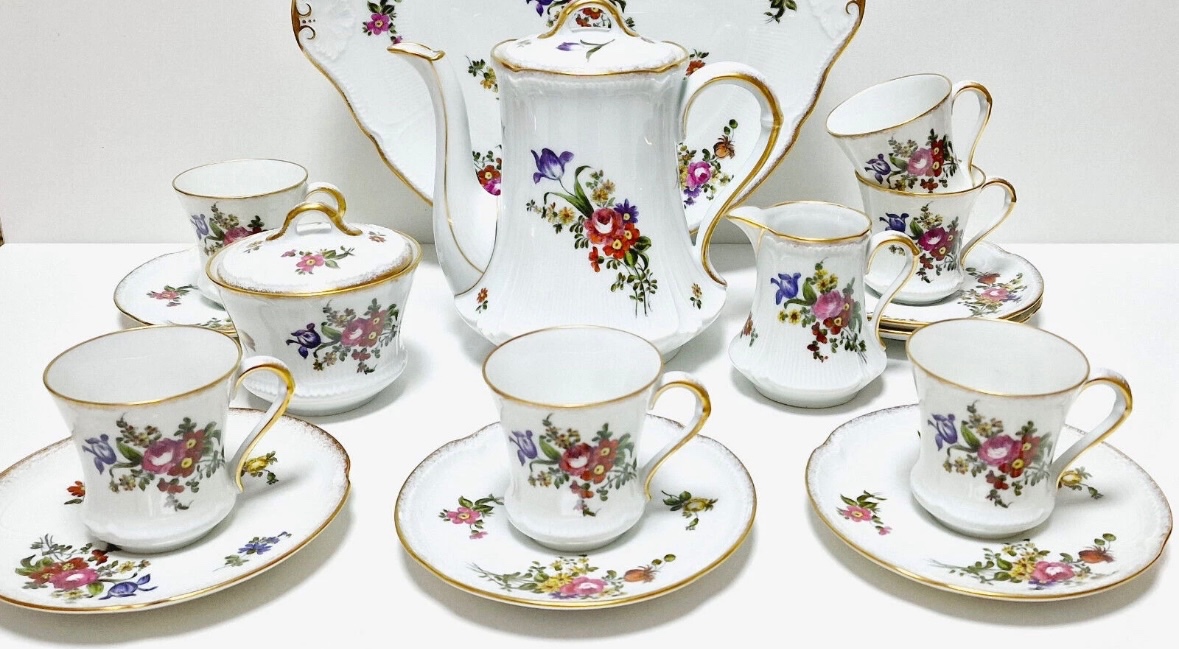 Porcelán Royal Limoges – moka servis pre 6 osôb, 15-dielna súprava – ručne dekorované (Décor à la main). Nikdy nebolo používané.