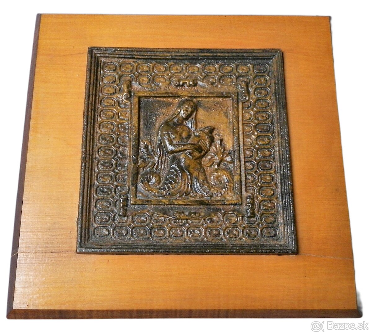 Starý litinový dekorativní kachel z konce 19. století reliéfně zdobený a zasazený v dřevěné desce o rozměrech 28,8 x 28,8 x 2,5 cm, rozměr kachle 17,8 x 19,2 cm, dřevěná deska na spodní straně mírně naprasklá, dobírka Packeta 5,-€.
