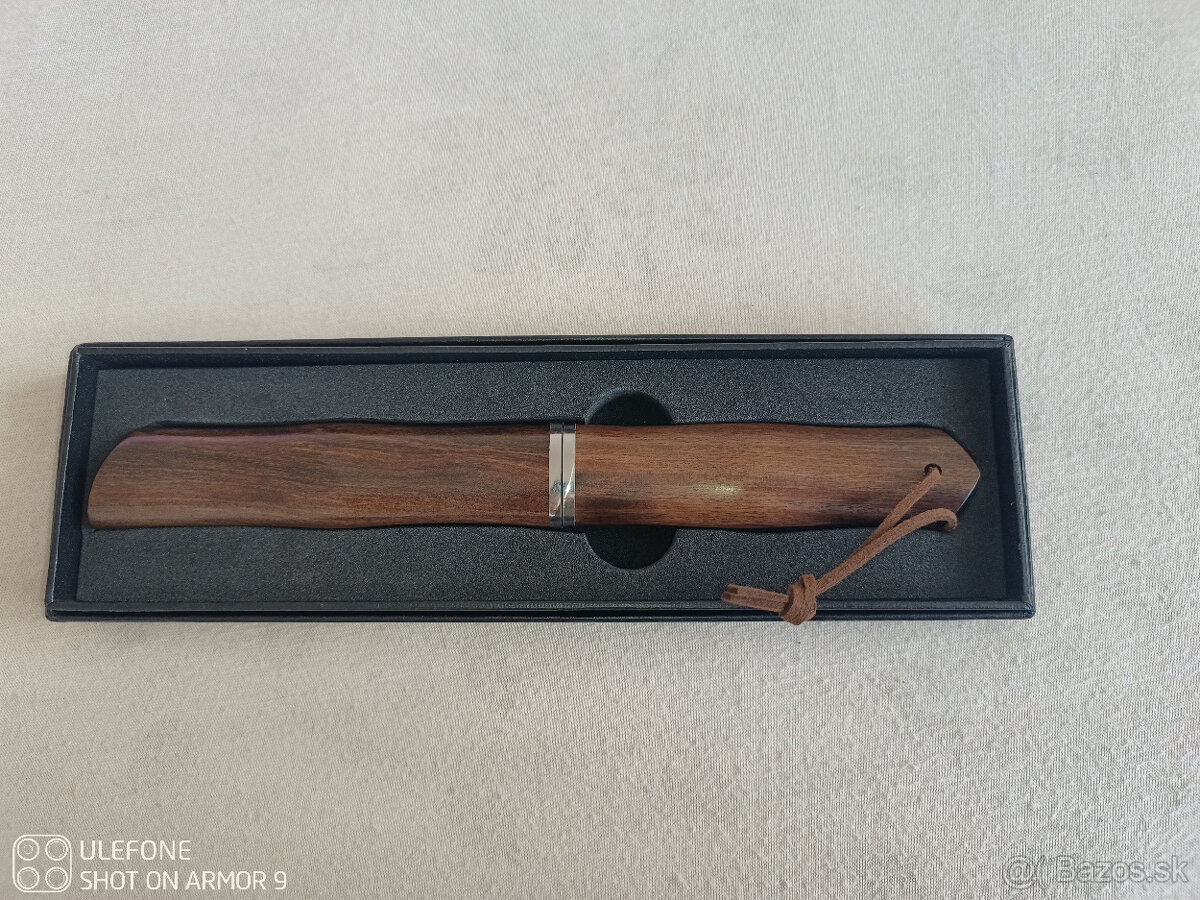 Krásny damaškový nôž v japonskom štýle, tant v darčekovej krabičke, rukoväť (10,5 cm) aj pošva (lakované, vyleštené) je naozaj parádne drevo, cez 22 cm celkovej dĺžky aj s pošvou, cca 11,5 cm dlhá damašková tanto čepeľ s naozaj peknú kresbou damašku, hrúbka čepele cez 3 mm, šírka cca 2 cm, nepoužívaný.