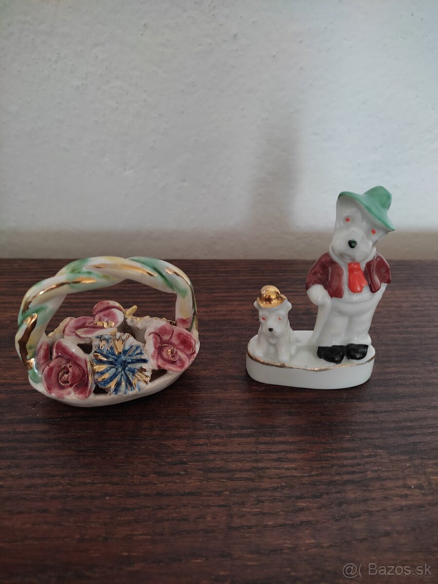 Predám porcelánovú sošku Pán a pes - 7 cm - 5€, košíček s kvetmi 5 cm, keramika - 1€.