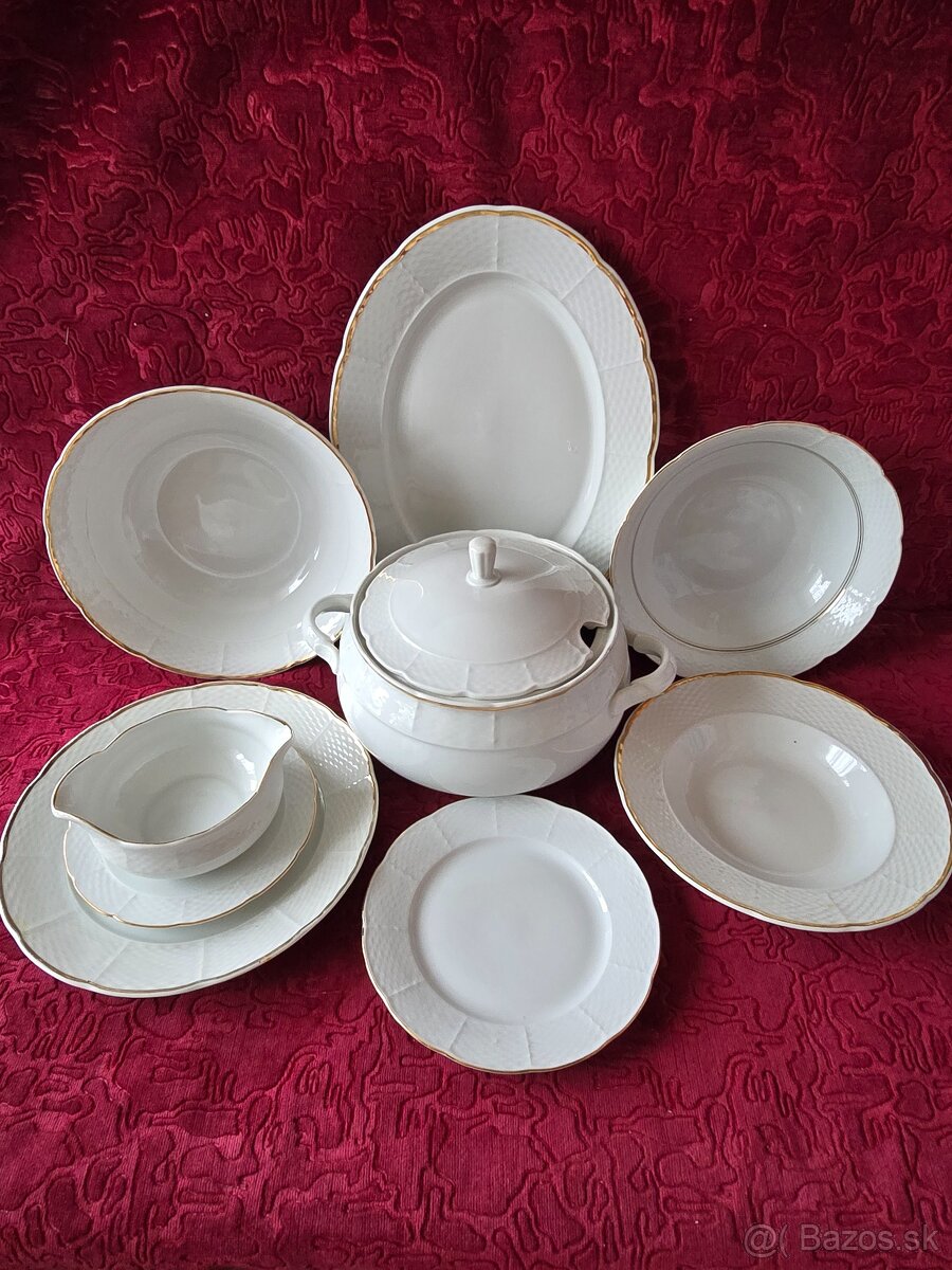 Obedova súprava, polievkova misa, 6plytke 6hlboke 6dezertne, 2kus šalatovky 1ks servirovaci oválny tanier, omačnik. Ak nie je možný osobný odber, posielam poštou. Pri kúpe nad 30eur a platbe na účet poštovné zdarma. Balím spoľahlivo. KLIK NA MOJ NICK.