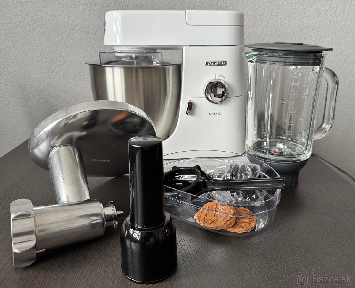 Predám kuchynský robot Kenwood Chef – celokovový, planetárne hnetenie, príkon 1200 W, kovové vnútorné prevody, antikorový plášť, objem misy 6,7 l, 6 rýchlostí, plynulá regulácia otáčok, tlačidlo PULSE, funkcie šľahanie, miesenie a miesenie, súčasťou hnetací hák, priehľadný kryt misy, k metla, balónová metla a mlynček na mäso.