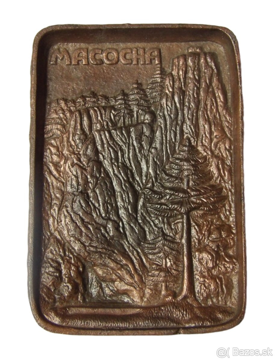 Litinový popelník z konce 19. století, reliéfně zdobený. Zobrazuje propast Macocha a okolní skalní útvary s nápisem Macocha v horní části, umělecká litina Železárny Blansko, rozměr 8 x 13 cm, dobírka Packeta 5,-€.