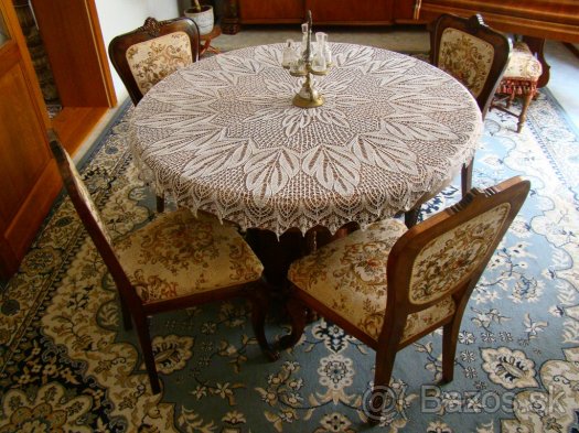 Predám starožitnú jedáleň, ktorá pozostáva z príborníka, sekretára, sofy, okrúhleho rozťahovacieho stola a 4 stoličiek, cena dohodou Rozmery: stôl priemer 140 + 70 cm, sekretár š: 140 cm, sofa š: 210 cm a príborník š: 240 cm.