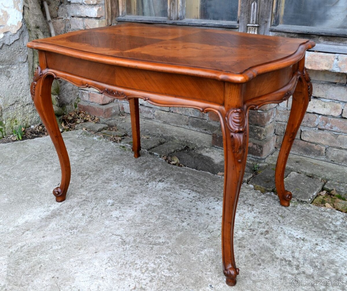 Pekný stôl z čerešňového dreva. zdobený peknými vyrezávanými detailmi a zaoblenými líniami. Na platni veľmi pekná intarzia.