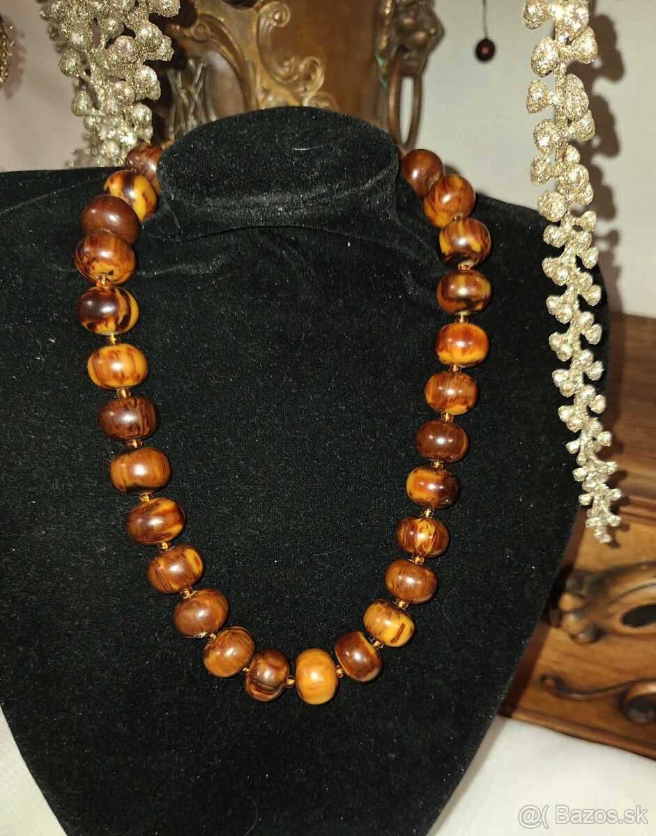 krásny , starožitný náhrdelník, bakelitové korálky na kovovom lanku, kombinované s mini korálkami z medového skla, vo veľmi dobrom stave