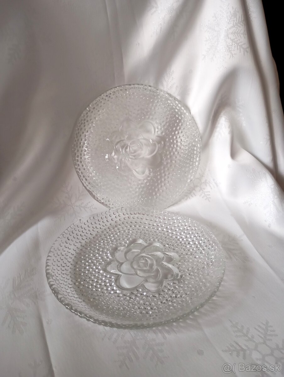 Sklenené československé vintage taniere s reliéfom ružového kvetu a perličkami, veľmi ženské:)