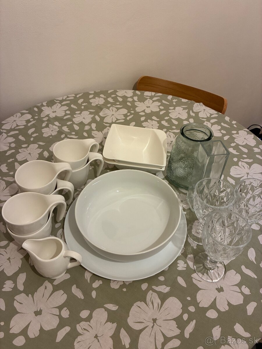 Predám rôzne kusy porcelánových riadov, sklenené poháre a dve sklenené vázy.