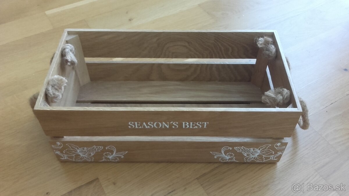Predám drevenú debničku na ovocie a zeleninu alebo čokoľvek iné podľa uváženia vhodná do kuchyne ako aj do záhradky. Debnička má 2 lanové rúčky na uchytenie. Rozmery: 30 x 15 x 11 cm. TOP stav, úplne nová, nepoužívaná. Bez poškodenia. Viac info v maily.