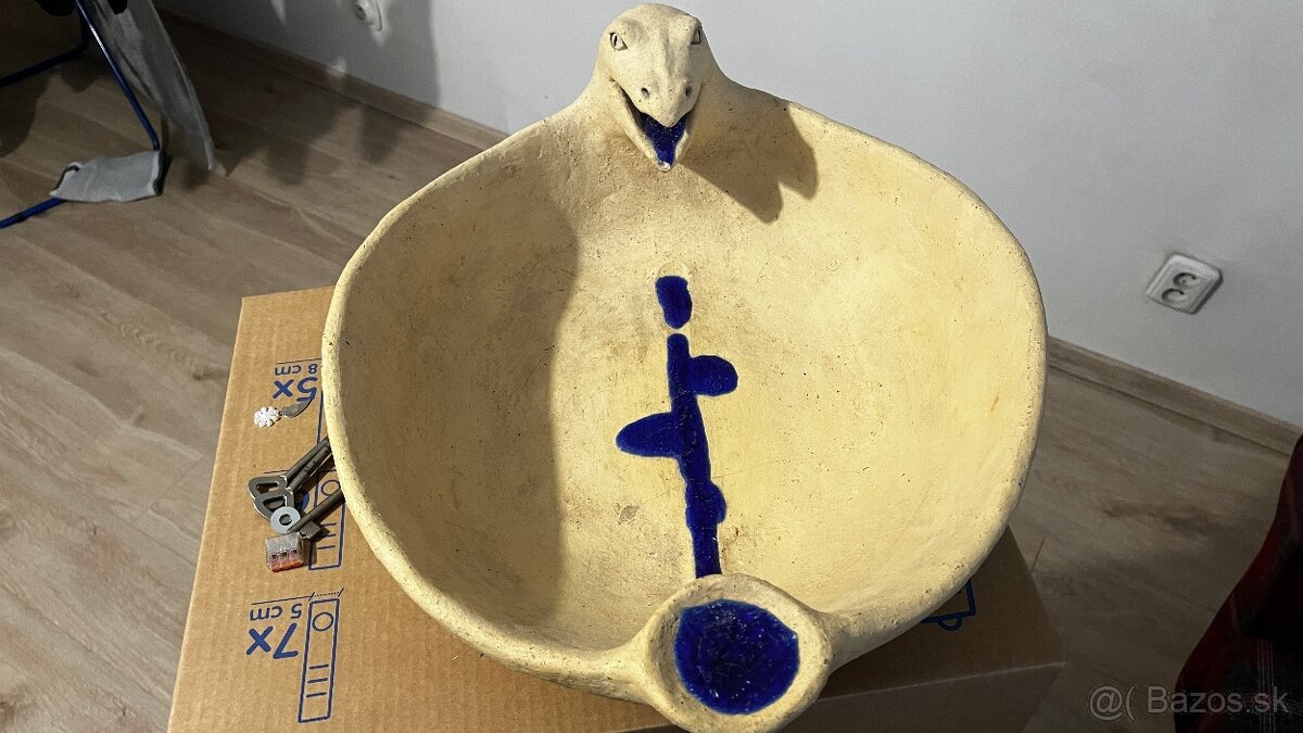 Predám originálnu ručne robenú keramickú misu s plastickým zvieracím motívom. Prírodná keramika, modrá glazúra, umelecký kus.