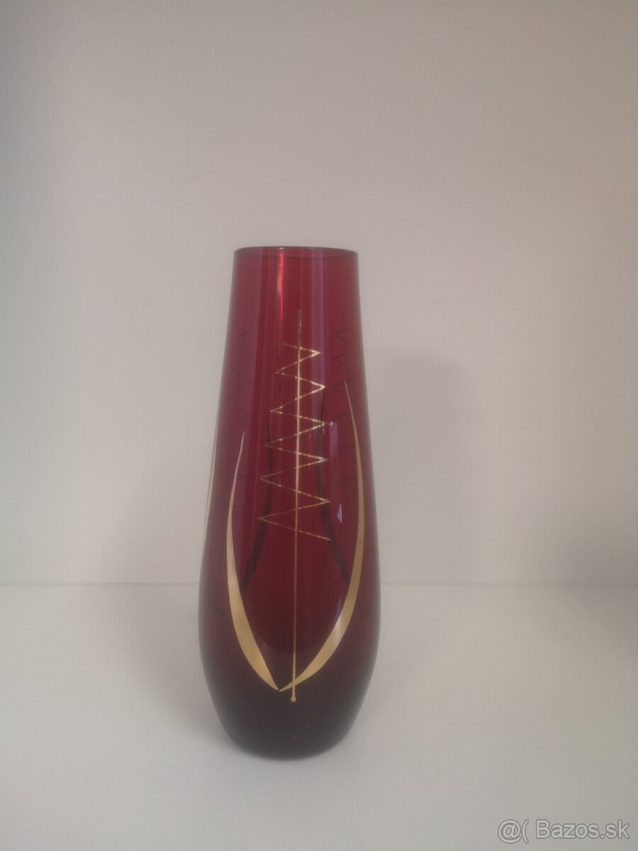 Retro váza, rubínové sklo so zlatým motívom. Po obvode vázy sú ručne maľované tri zlaté motívy. Výška 17 cm. Stav, ako nová.