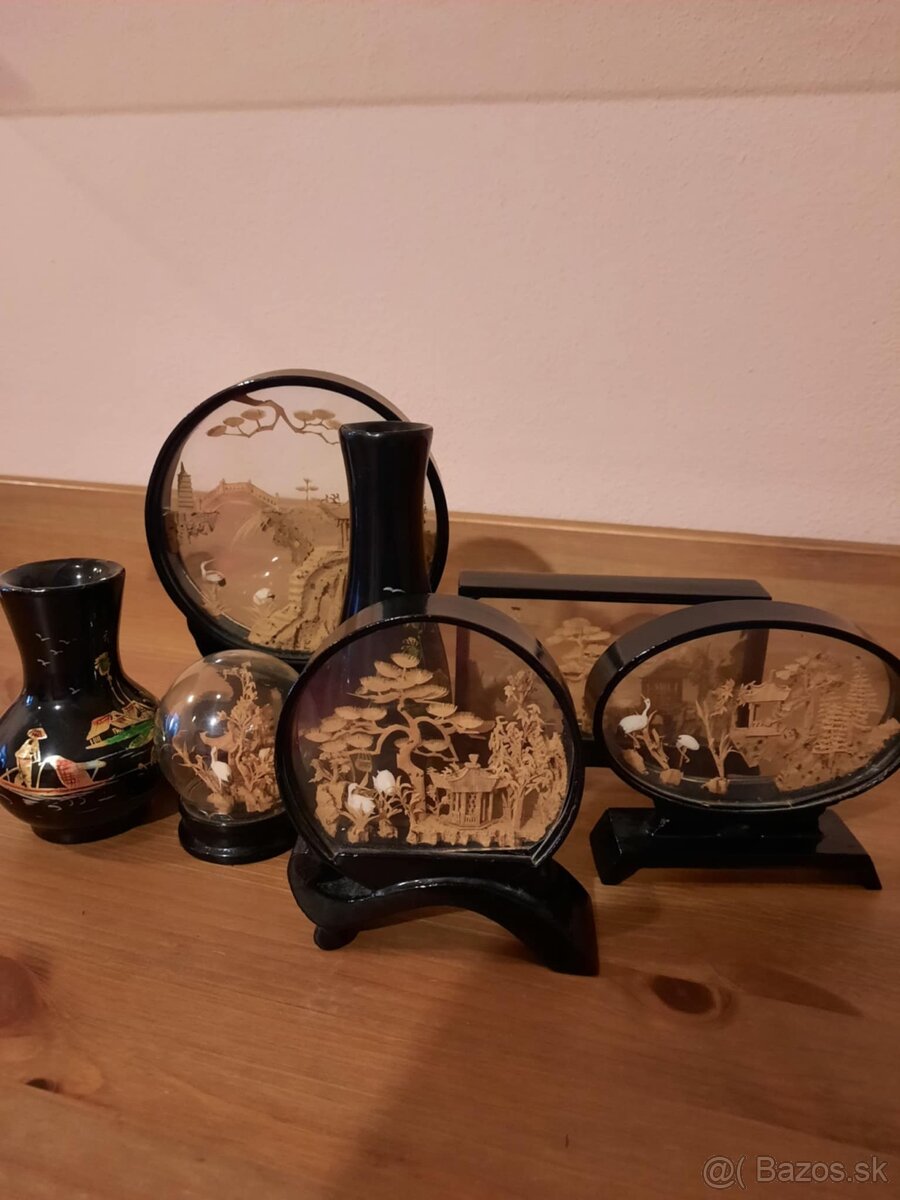 Celá sada starožitných doplnkov, ktoré majú vnútro vyplnené korkovými obrazcami.