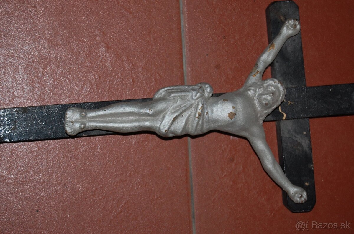 Kríž z liatiny. Premaľovaný striebrenkou, pôvodne zlátený. Veľkosť 50 cm s krížom. Samotný korpus Krista 30 cm. Osobný odber Trnava.