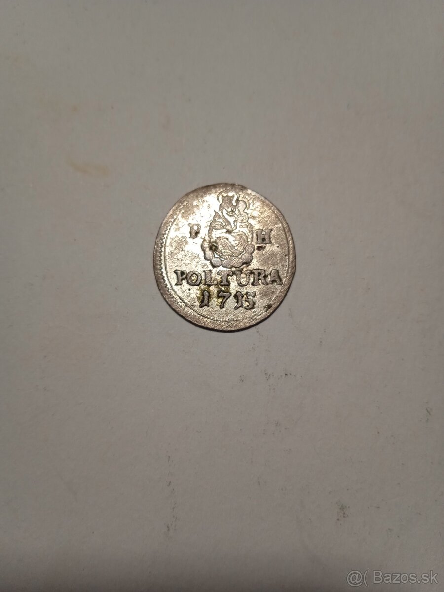 Predám peknú striebornú polturu Karola VI. z roku 1715. Minca nemá značky pri dátume ( kvietky alebo bodky ). Cena mince je 55 EUR + poštovné.