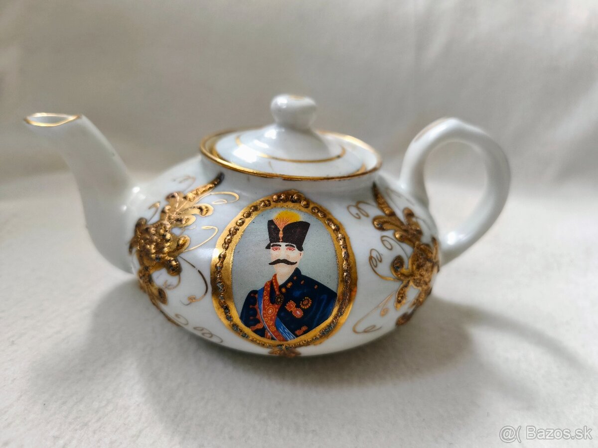 Zdobenie: veľmi bohatá zlatá východná ornamentálna výzdoba s 24 karát zlatom s portrétom Peržana na 2 stranách brucha nádoby čajníka