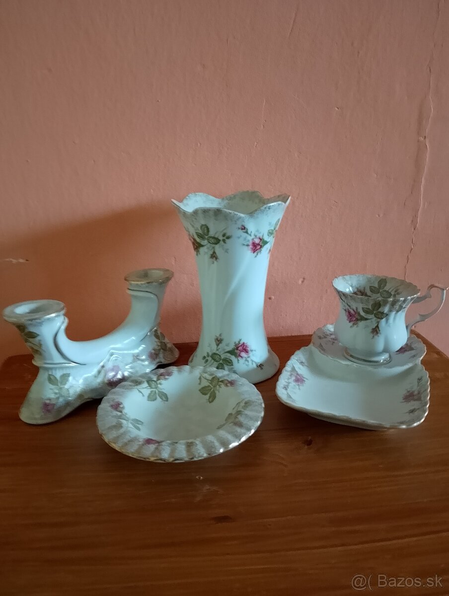 sada porcelánových zberateľských predmetov s motívom ruží a zlatým lemovaním.