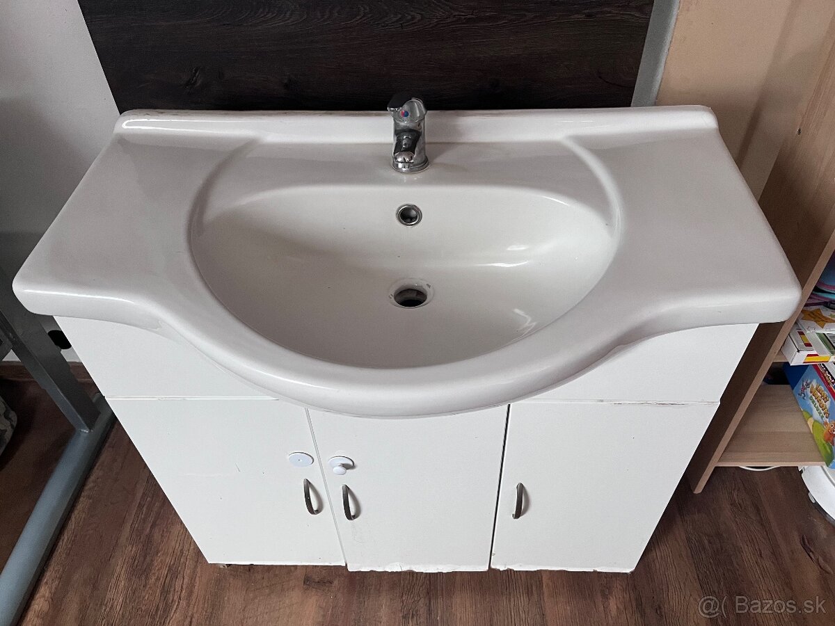 Možnosť zobrať si umývadlo aj so skrinkou. Spodná časť skrinky je už poznačená vodou avšak plne funkčná.