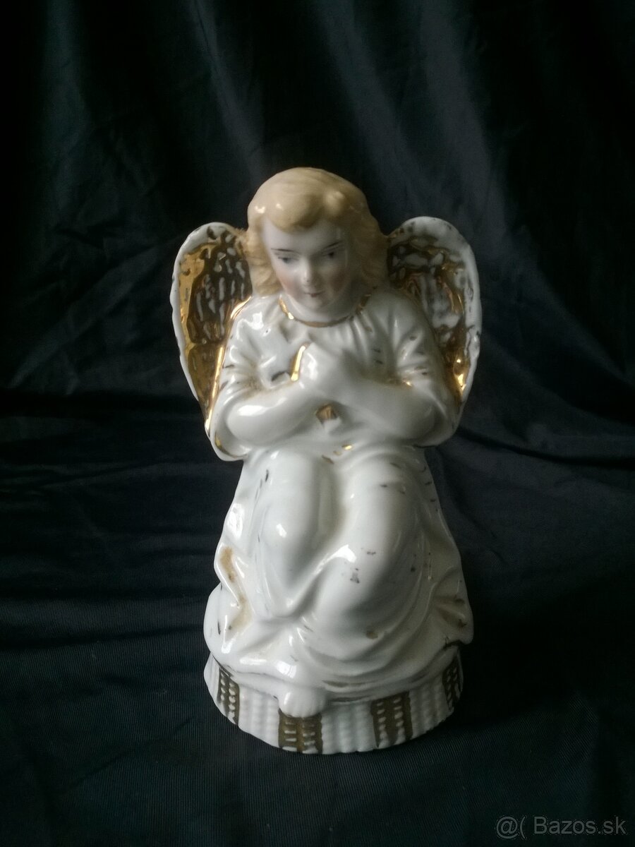 Starý porcelánový Anjel ochranca. stará cca 100 ročná porcelánová figúrka. Krásne zachované -nepoškodené, na spodku z vnútornej strany značené číslom 25. Pekne zachované zlátenie, ručne maľovaná tvár. výška 15 cm.