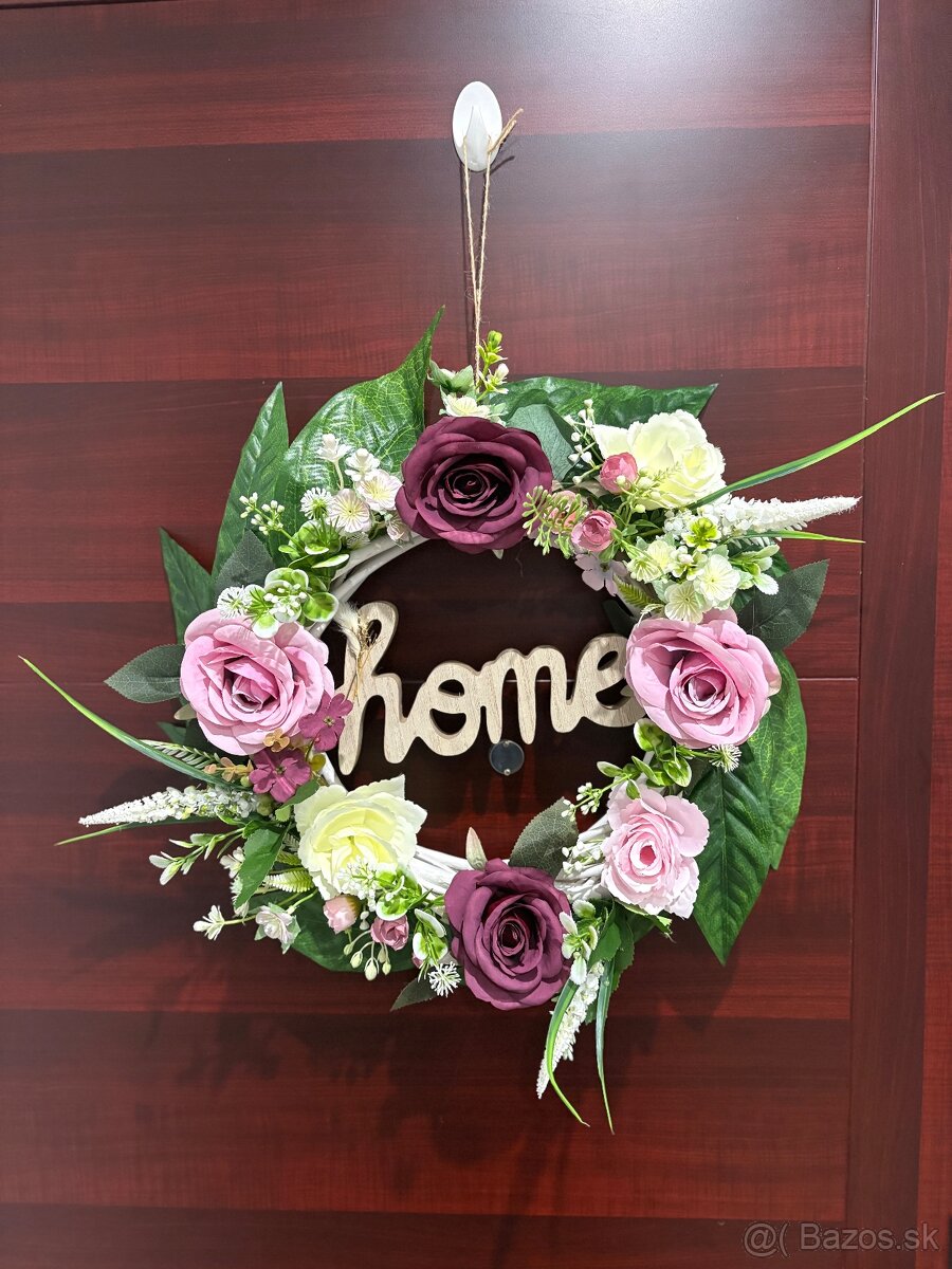 Ponúkam na predaj ručne vyrábaný veniec na dvere vhodný do interiéru aj exteriéru. Veniec je zdobený umelými kvetmi a doplnkami.