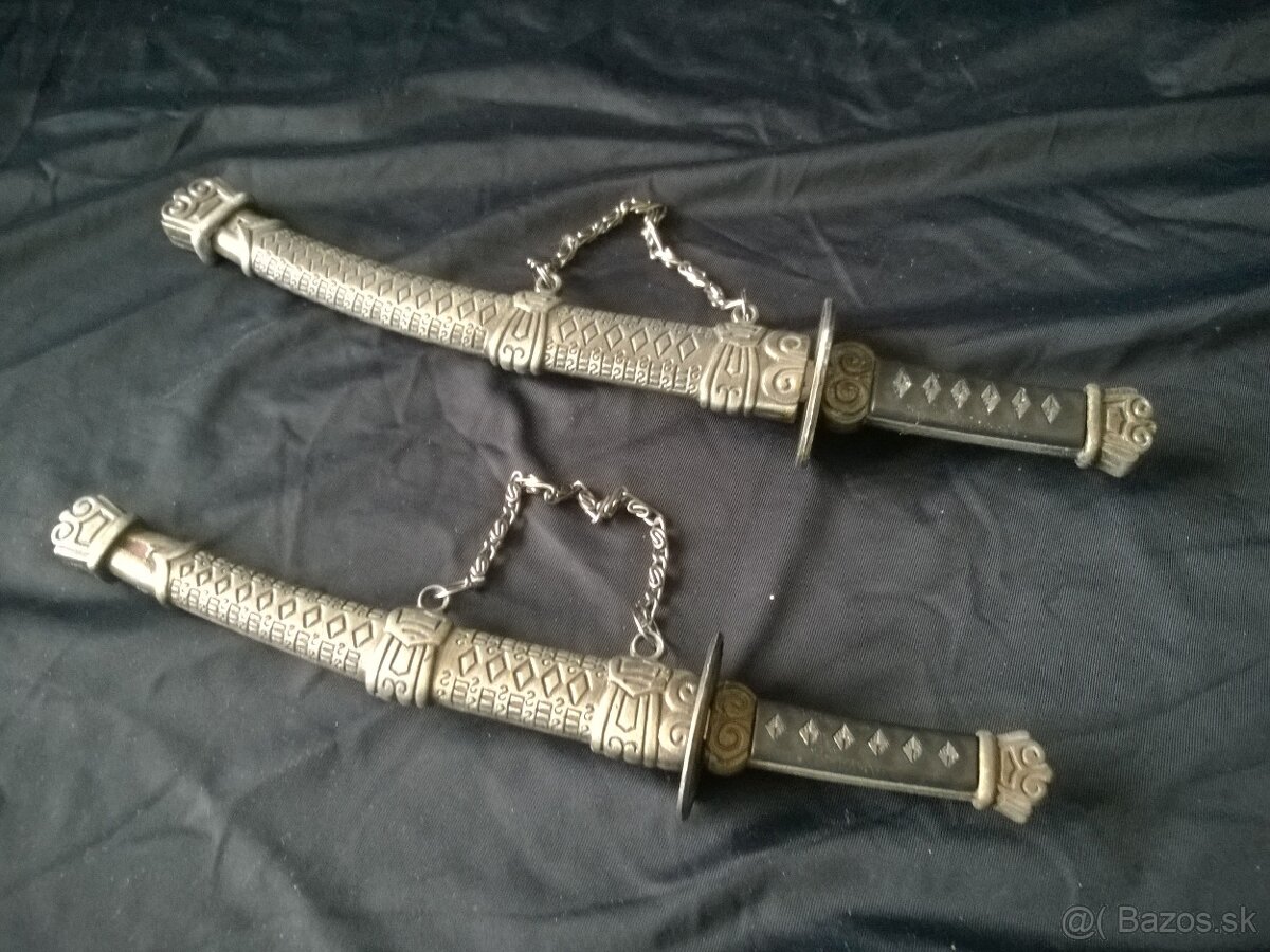 Pekne zdobené kovové meče. Menší rozmer 26cm a 21 cm. všetko kov. Čepeľ oceľová. Výborne zachované nepoškodené. Krásne zdobené rukoväte a pošvy.