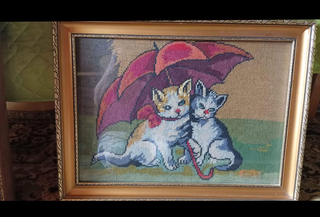 Predám zarámovaný vyšívaný obraz: Mačky pod dáždnikom 54x41cm.