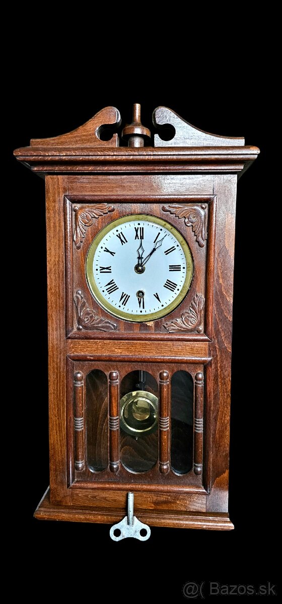 Predám starožitné nástenné kyvadlové hodiny v masívnej drevenej skrini s krásnou tmavou farbou dreva a jemnými vyrezávanými detailmi. Predná časť je presklená, takže je viditeľné mosadzné kyvadlo, ktoré dodáva hodinám elegantný vzhľad. Hodiny sú aj s originálnym kľúčikom.