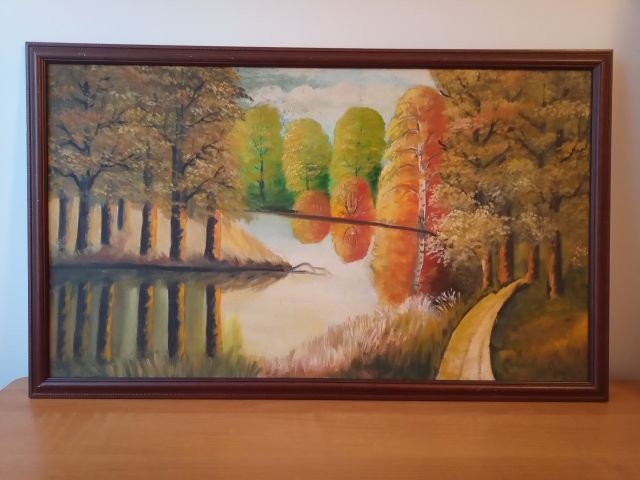 Predám naivný obraz jesennej krajinky so stromami a vodou.