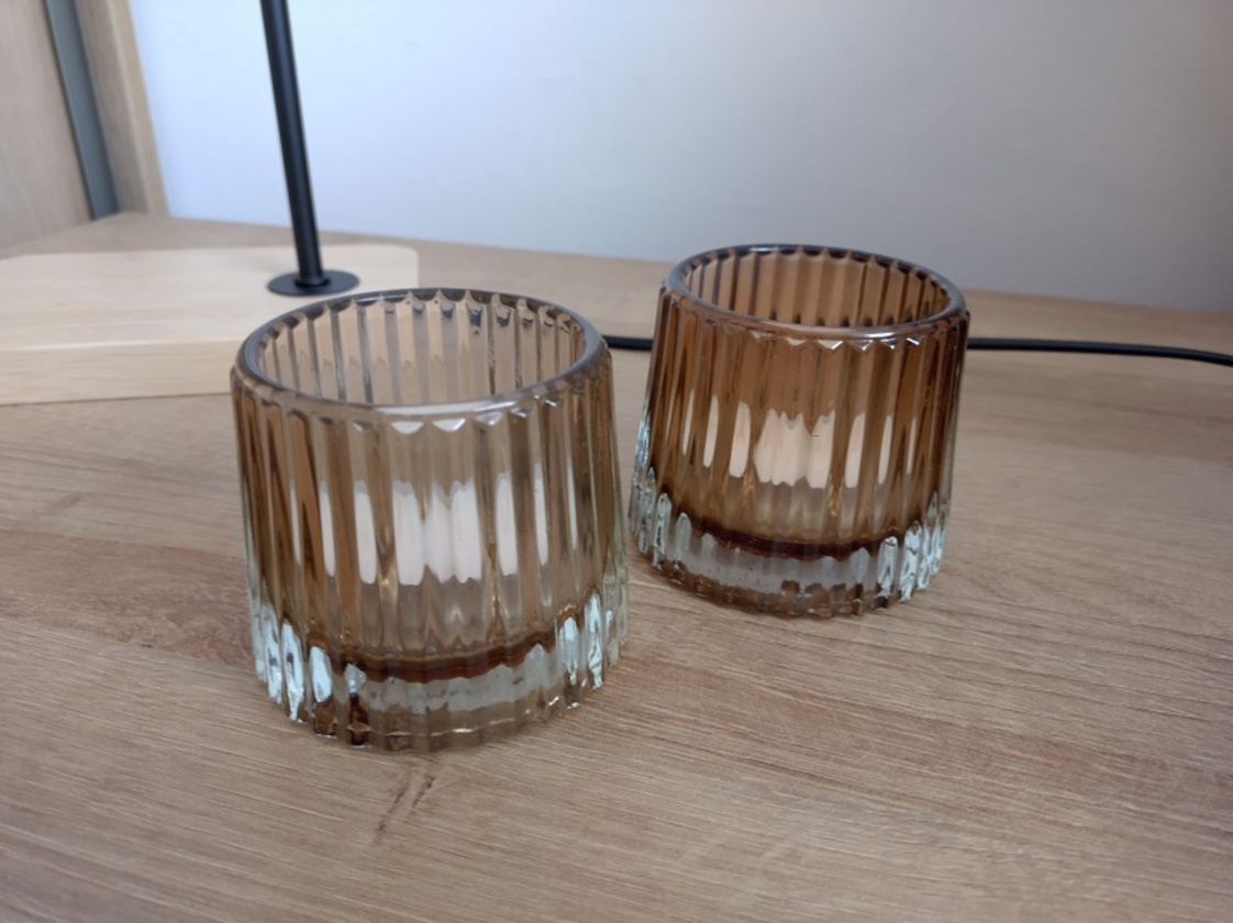 Napredaj skleneny svietnik zo skla, hnede, rebrovane sklo. Vyska aj priemer cca 7cm. Cena spolu. Nepoužité