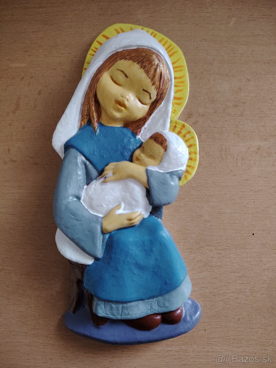 Tento keramický reliéf zobrazuje Pannu Máriu s dieťaťom. Je to bežný typ náboženského zberateľského predmetu a umeleckého diela.