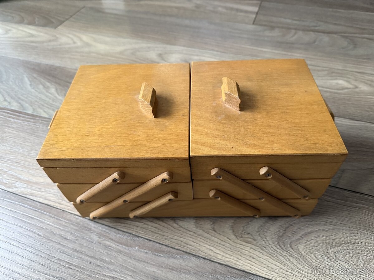 Predám retro drevenú troj-dielnu kazetu / truhličku, bola vyrobená okolo roku 1970, ideálna na úschovu drobností, šperkov alebo ako dekorácia.