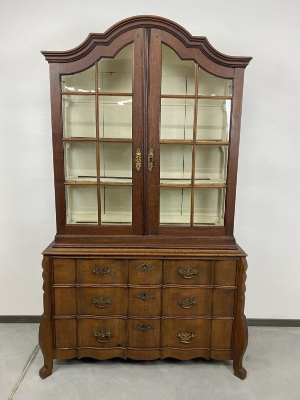 Široká klenbová vitrína na uloženie porcelánu,spodnú časť tvorí 3 šuplíková komoda ,šuplíky na komode tvarované do vĺn. Materiál - masívny dub