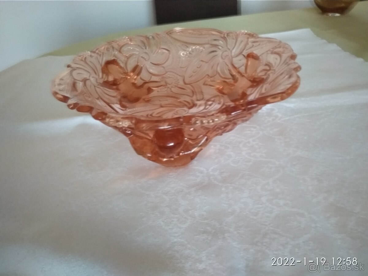 Art Deko, starožitná ambrová krásná oválná mísa. - [15.1. 2026]Krásné masivní staré lisované sklo z dávných časů. Výška 10,3 cm, délka 25,5 cm, hloubka uprostřed 14 cm. Na své stáří má pěkný stav, jen u vlnek z vnitřní strany má místy drobné oděrky viz poslední dvě fota. Důkladně zabalím, střepy neposílám.