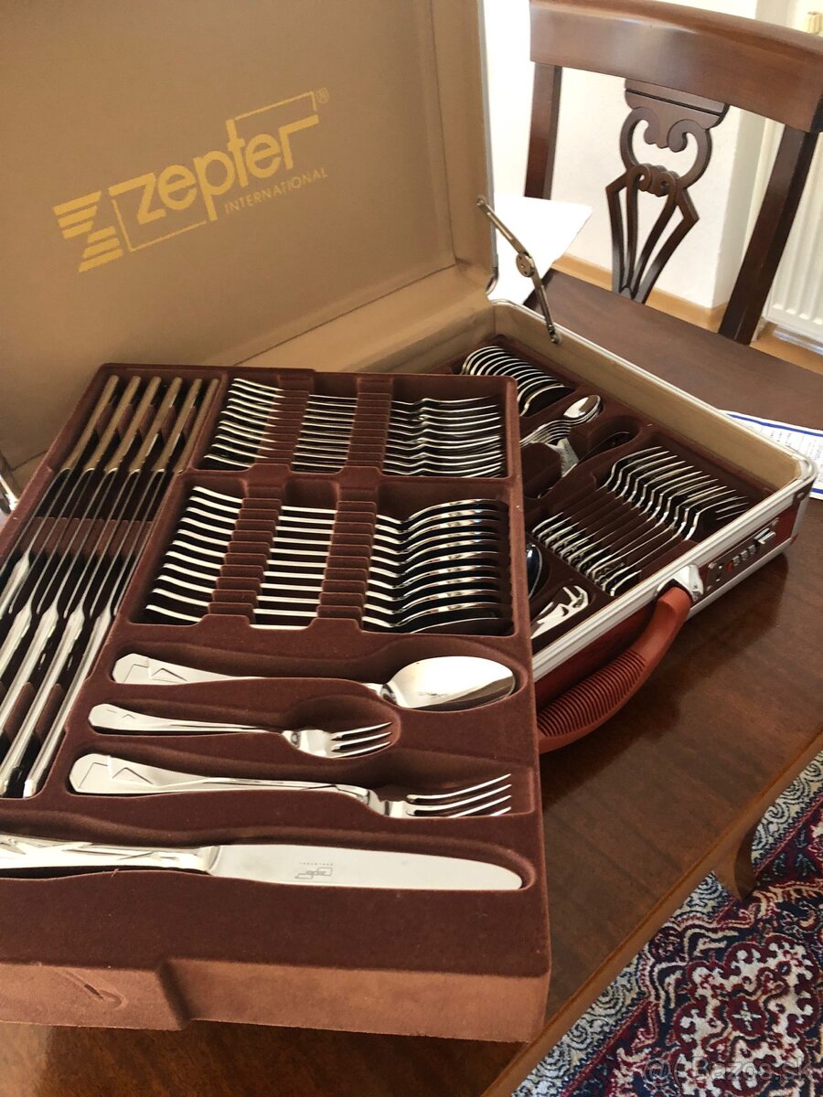 Kompletná sada pribor Zeter pre 12 osob + servírovacie lyzice. Pribor je v drevenom kufríku.