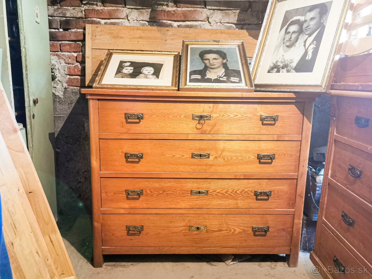 Predám krásne starožitné komody. Komody sú vo veľmi zachovalom stave, sú veľmi precízne, luxusne spracované, vyžadujú len málo reštaurovania napríklad preleštenie mosadzních kovaní a podob. Materiálovo sú vyrobené z kvalitného poctivého pevného smrekového masívu s peknou kresbou dreva, povrchovo upraveného lakom. Príjemným historickým detailom sú mosadzné kovania pričom prvá zásuvka/šuflík disponuje aj otočným kľučikom. Pri správnom nasvietení sa veľmi pekne lesknú. Sú vhodné do luxusného interiéru na oživenie priestoru alebo do priestoru s historickým kontextom, respektíve nestratia sa ani na chalupe kde prevláda cit k poctivým dreveným materiálom. Na predaj sú 2 kusy, obe majú 4 zásuvky prvý kus: rozmer výška:120 x 106 hĺbka 60. Druhý kus: 120 x 106 hĺbka 60, druhá komoda má pod doskou z prednej strany drevorezbu - vyrezaný rastlinný motív pričom má aj ako celok táto komoda viac zdobenia (vyrezaných ornamentov). Cena je vedená za kus. Pri odbere 2ks zľava.