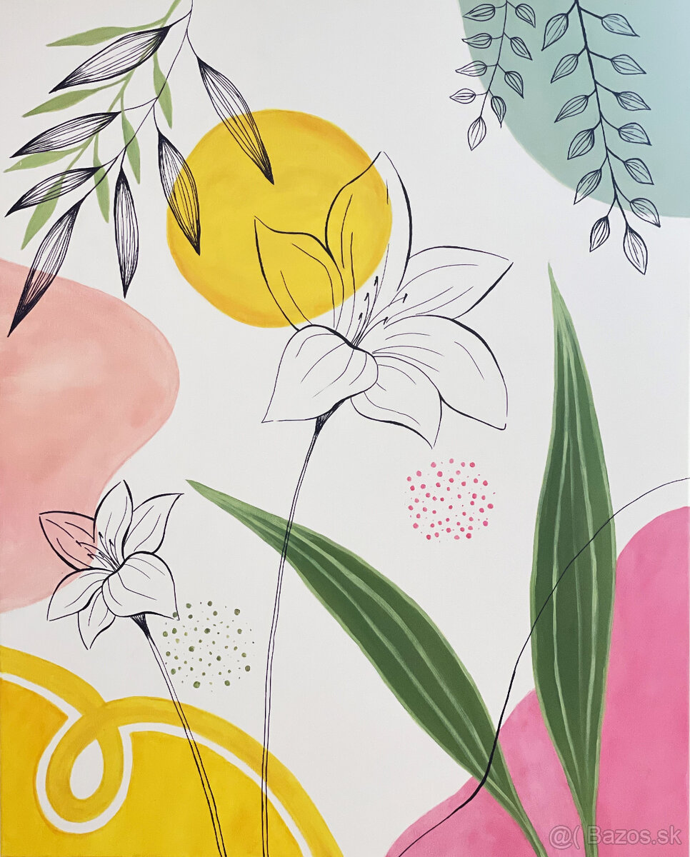 Tento pozitívny a veselo-farebný obraz som namaľovala akrylovými farbami a markermi. Oživí každý interiér, je väčších rozmerov a zároveň pôsobí vzdušne.