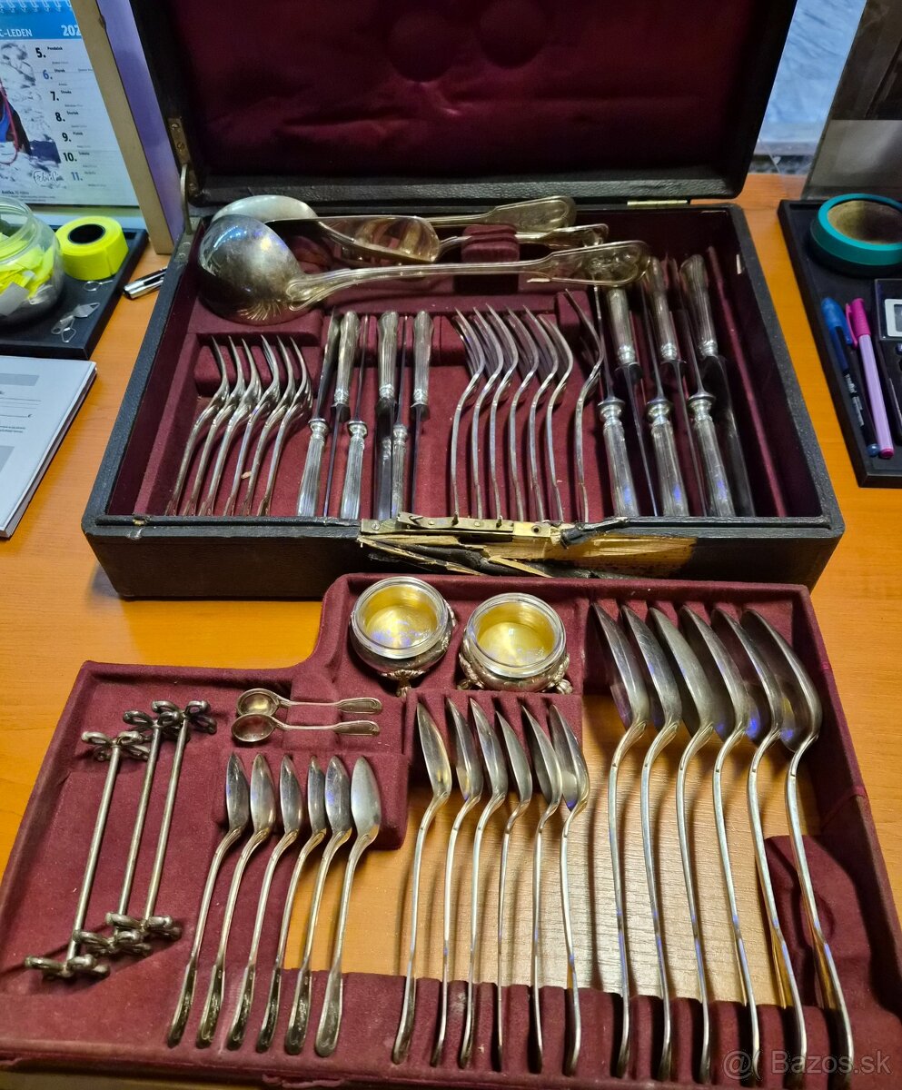 Predám starožitný značený ALPACA 6 dielny príbor viď fota, kazeta-/kufor poškodení pri otváraní. Cena dohodou , info cez kontaktný formulár alebo predvoľba 0903 a iné viď foto...