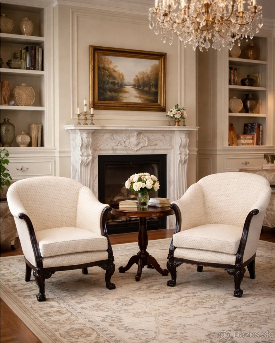 Ponúkam na predaj dve rovnaké staroẓ̌itné vyrezávané kresla. Kreslá sú kompletne zreṣ̌taurované. Drevo morený a lakovaný. Nové č̣alunenie. Rozmery - Ṣ̌ 79...V 90...HS 53...VS 50 cm. Cena za 1 kus 400 €. Pozrite moje dalṣ̌ie ponuky