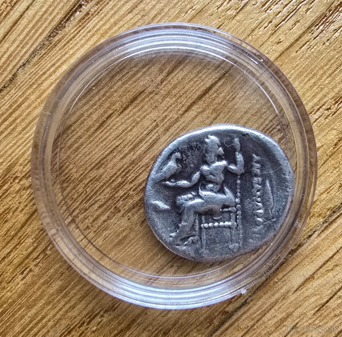 Reverz: Zeus sediaci na tróne vľavo, drží orla a žezlo, pod trónom AI, v ľavom poli had, vpravo legenda AΛEΞANΔΡOY.
