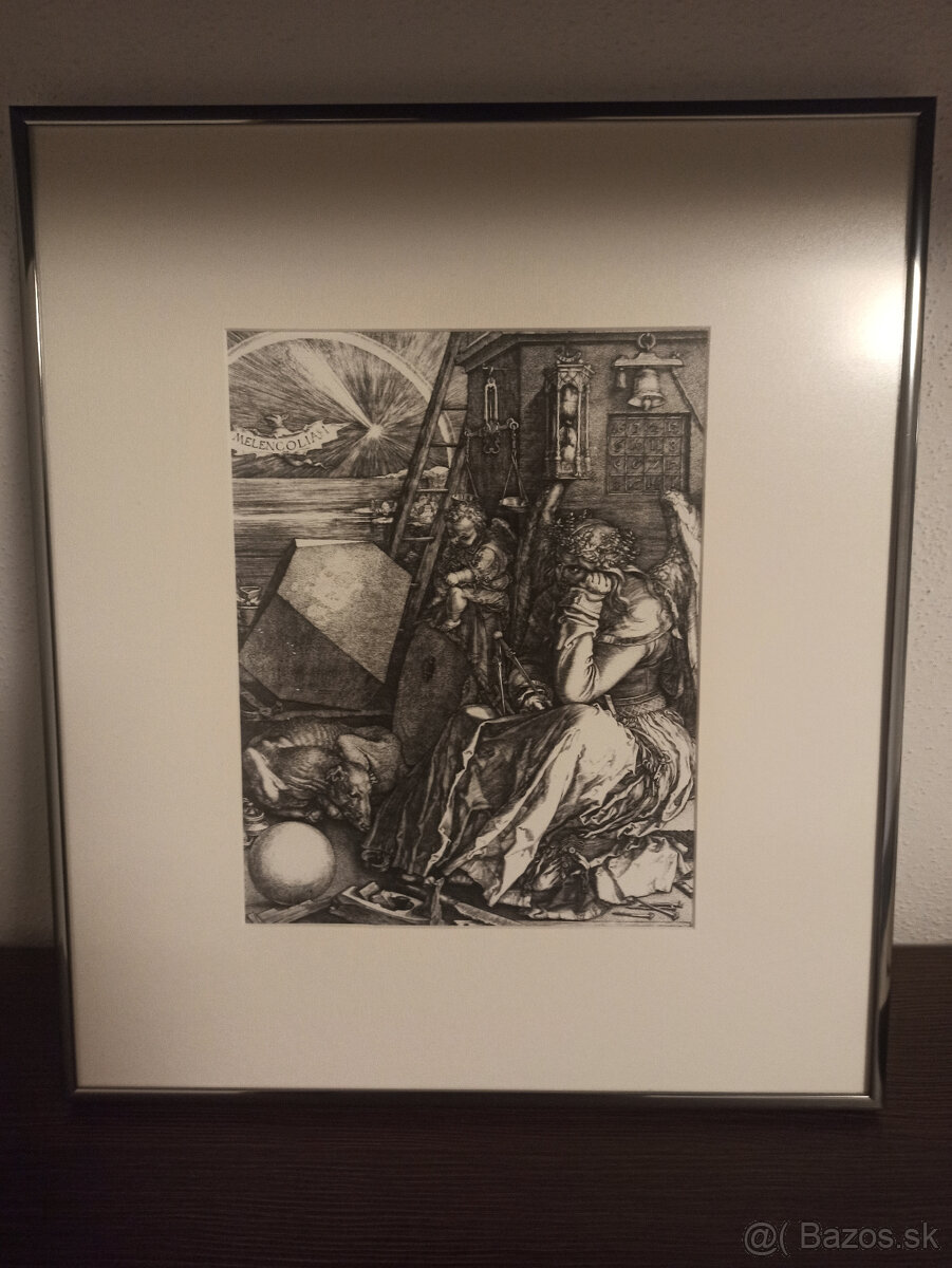 Predám reprodukciu Melanchólia od Albrechta Durera, Hliník. rám 35 x 40cm, výrez v pasparte 18,5 x 24cm; tlačené na archívnom papieri, antireflex. sklo