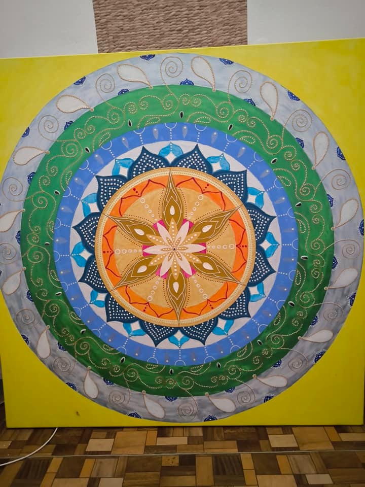Predám maľovanú Abstract obraz s kruhom vzorom, mandala na plátne natiahnutom na drevenom ráme, rozmer 105x105 cm.