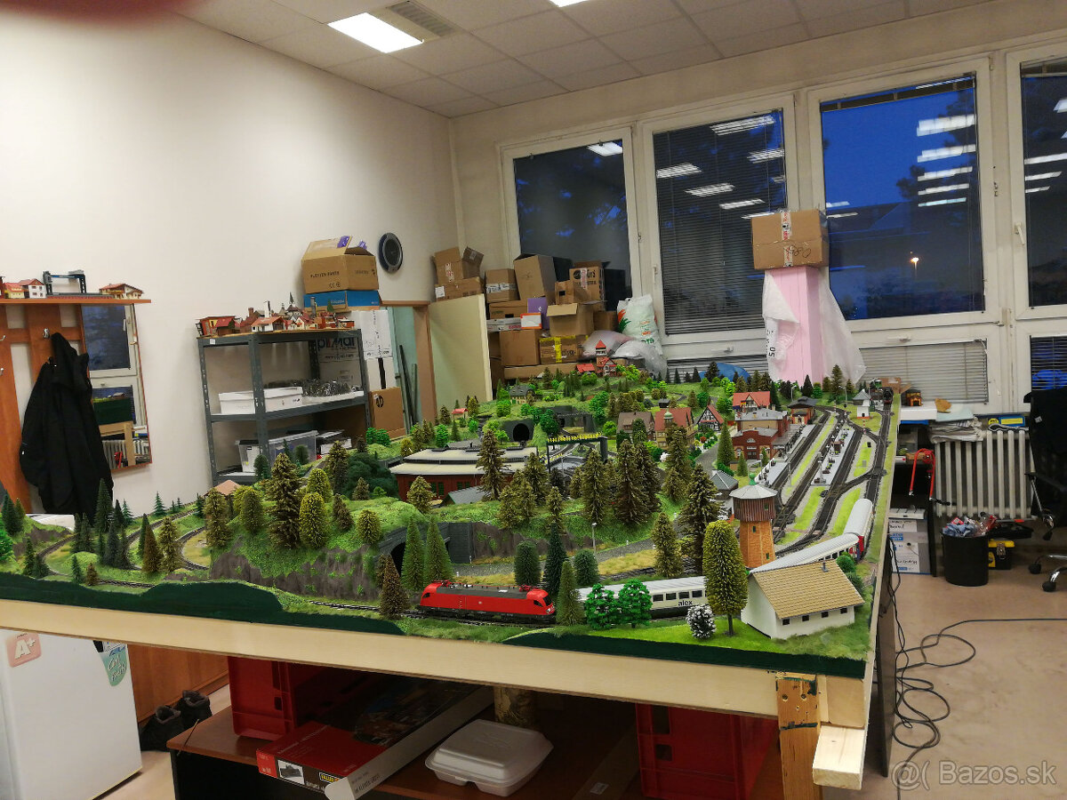 Kolejiště je postaveno pro digitální provoz souprav (možno přepojit na analog) a analogové ovládání příslušenství.!PRODÁNO! (Můžete mít podobné, v případě zájmu volejte na níže uvedené tel. číslo, nebo pište na mail). Kolejivo profilované (Piko A-gleis + Fleischmann), 3 okruhy vzájemně propojené. Kolejiště je obsluhováno z ovládacího pultu, který obsahuje ovládání elektromagnetických výhybek, světelných semaforů s vazbou do kolejí, odstavných úseků trati, točny se 6 výjezdy a tří okruhů nočního osvětlení (domky, nádraží, depo). V trase je jeden přejezd se závorami, ovládaný průjezdem vlakové soupravy a jeden přejezd nechráněný. Součástí ceny nejsou vyobrazené vlakové soupravy a napájecí trafa.